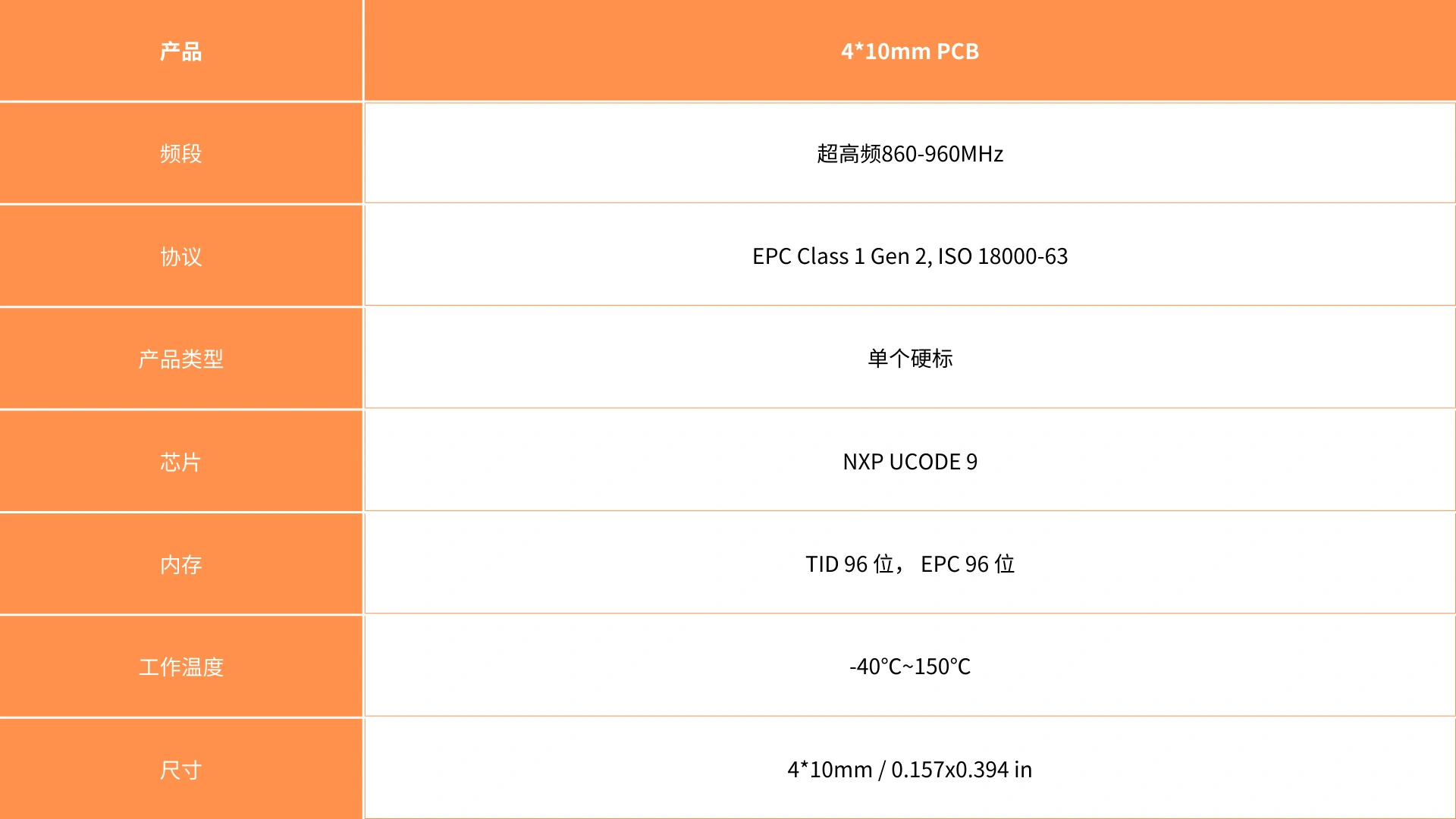 PCB耐高温硬标专为工业制造、医疗器械、资产管理、车辆管理及物流追踪设计。其耐高温、抗金属干扰特性,确保在高温及金属环境下稳定识别。耐用性强,防水防腐,适应极端工作环境,提供精准持久的标识支持。无论是追踪贵重资产、管理医疗器械,还是优化物流流程,PCB耐高温硬标都是可靠的选择。产品提供单个硬标的交货形式。